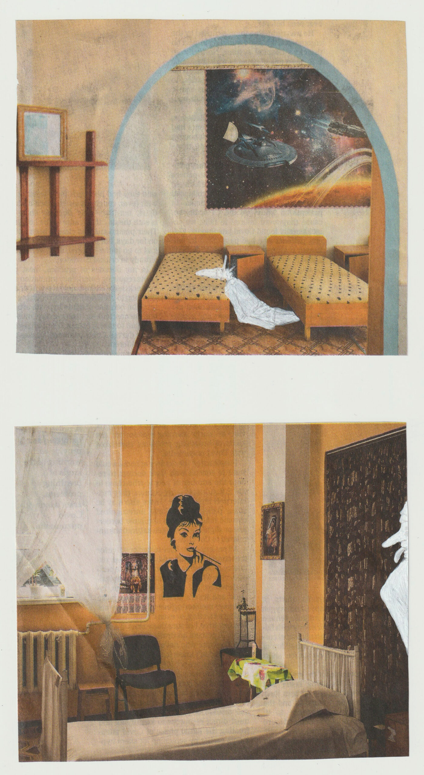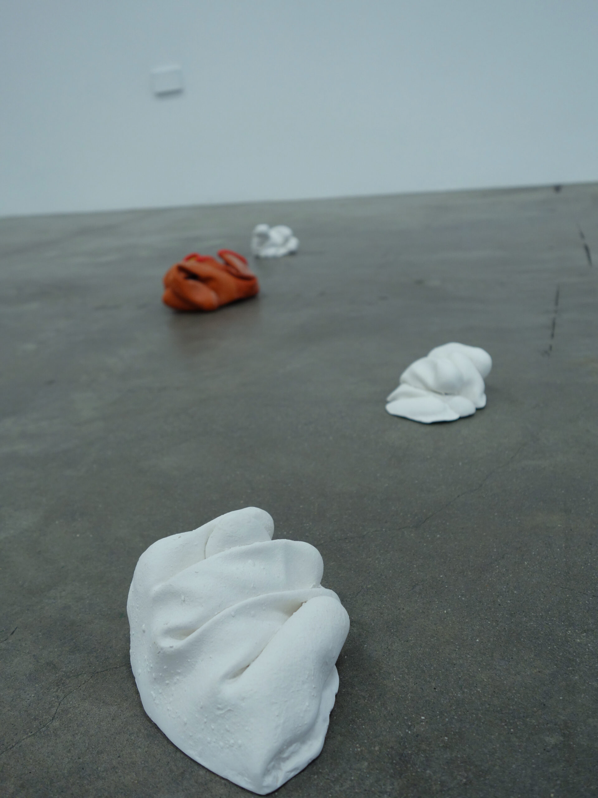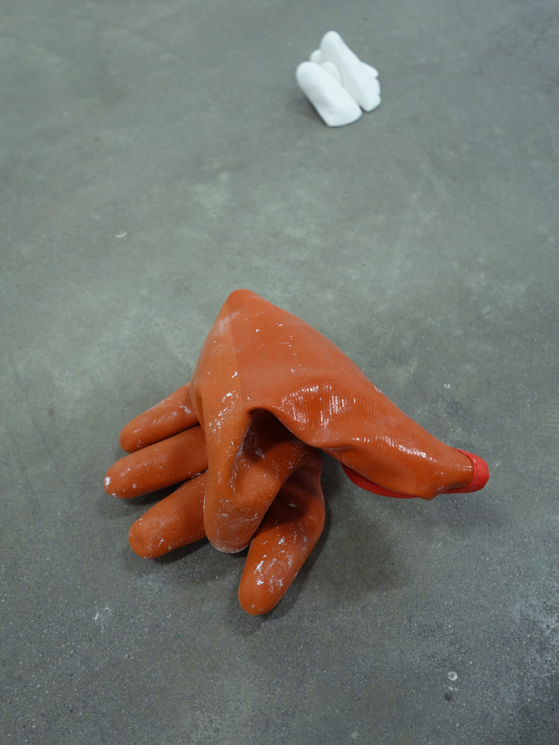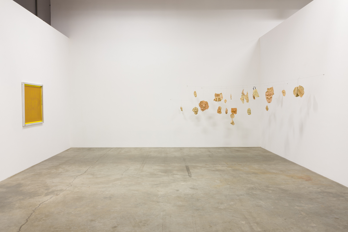 This exhibition is the result of an irresolute sequence of interruptions and deviations, centered around the Commedia dell’Arte character of Pulcinella. This show was supposed to open last March, with the wallpaper designs and other works. Once the confinement started here in New York, I began drawing Pulcinelles on images from the newspaper that arrived each morning at our door. The casts of the apotropaic Mano Figa or “fig hand” gestures were made when I was able to return to my studio later that Spring. The latex masks and accompanying film date from the last three months. All of these elements have a physiognomy, I see faces even in the cast hands. Yet, like masks, their expressivity is made uncanny by their arrested fixity. Unlike living faces, they neither move nor twitch, they remain set in their contortions.