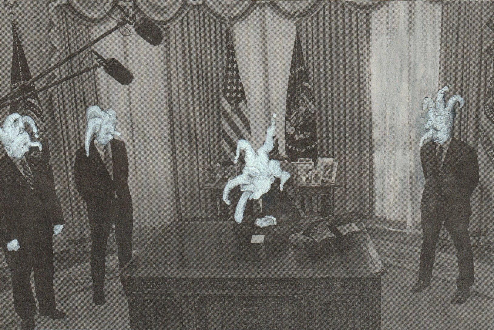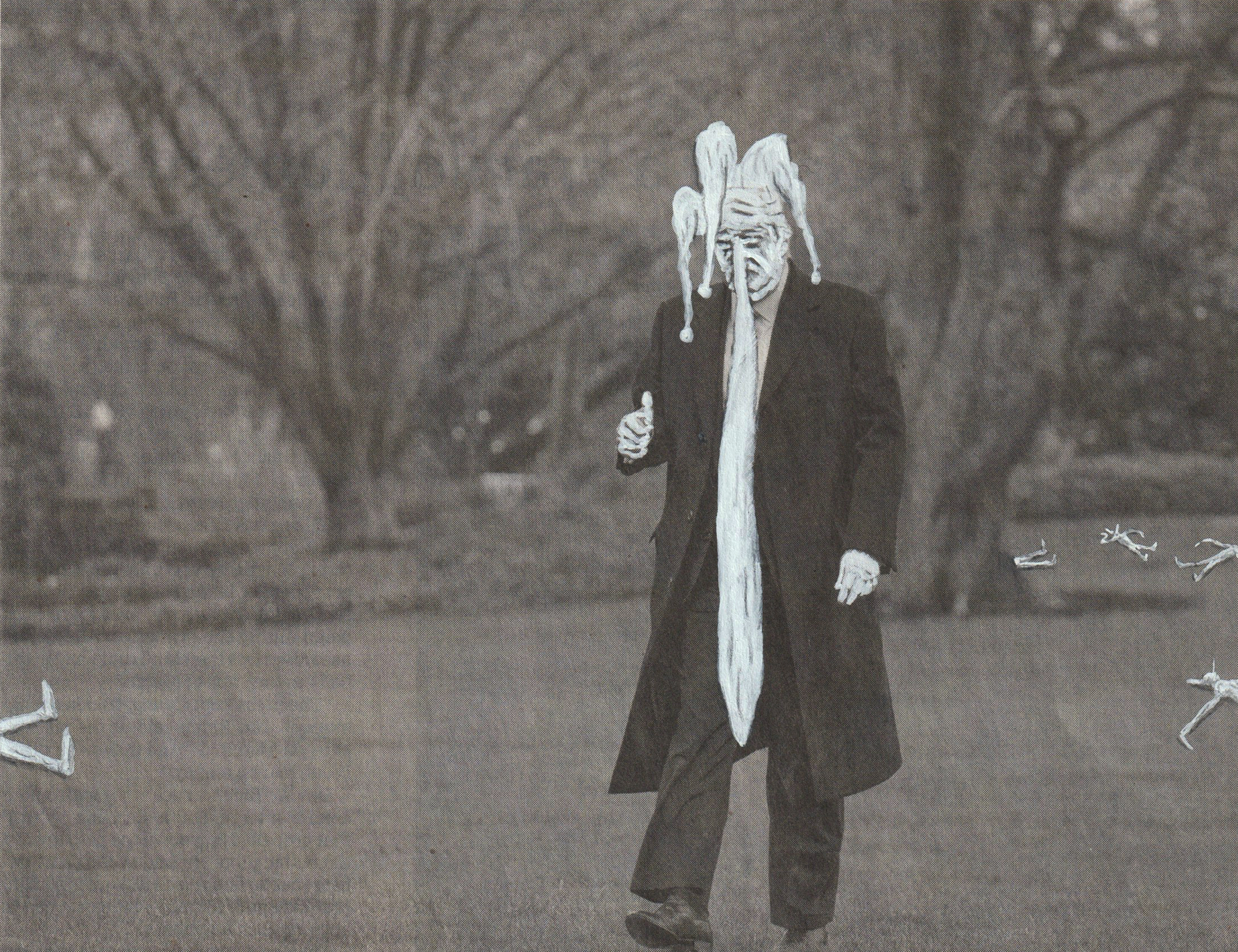Rather than seek to adhere to a preliminary concept, I worked in pursuit of an idea or rather, its cipher. The idea is that of comedy, and its cipher is Pulcinella, whose character is defined by its inherent resistance to characterization. I chose processes and materials that were inherently receptive to contingency and deviation, and chose to work with rather than against the errors and disruptions that I encountered along the way. None of these decisions can be characterized as intentions, as they were anchored in the pursuit of an interrogation that I am having trouble naming, because it has too many names, too many horizons, too many interruptions and deviations.